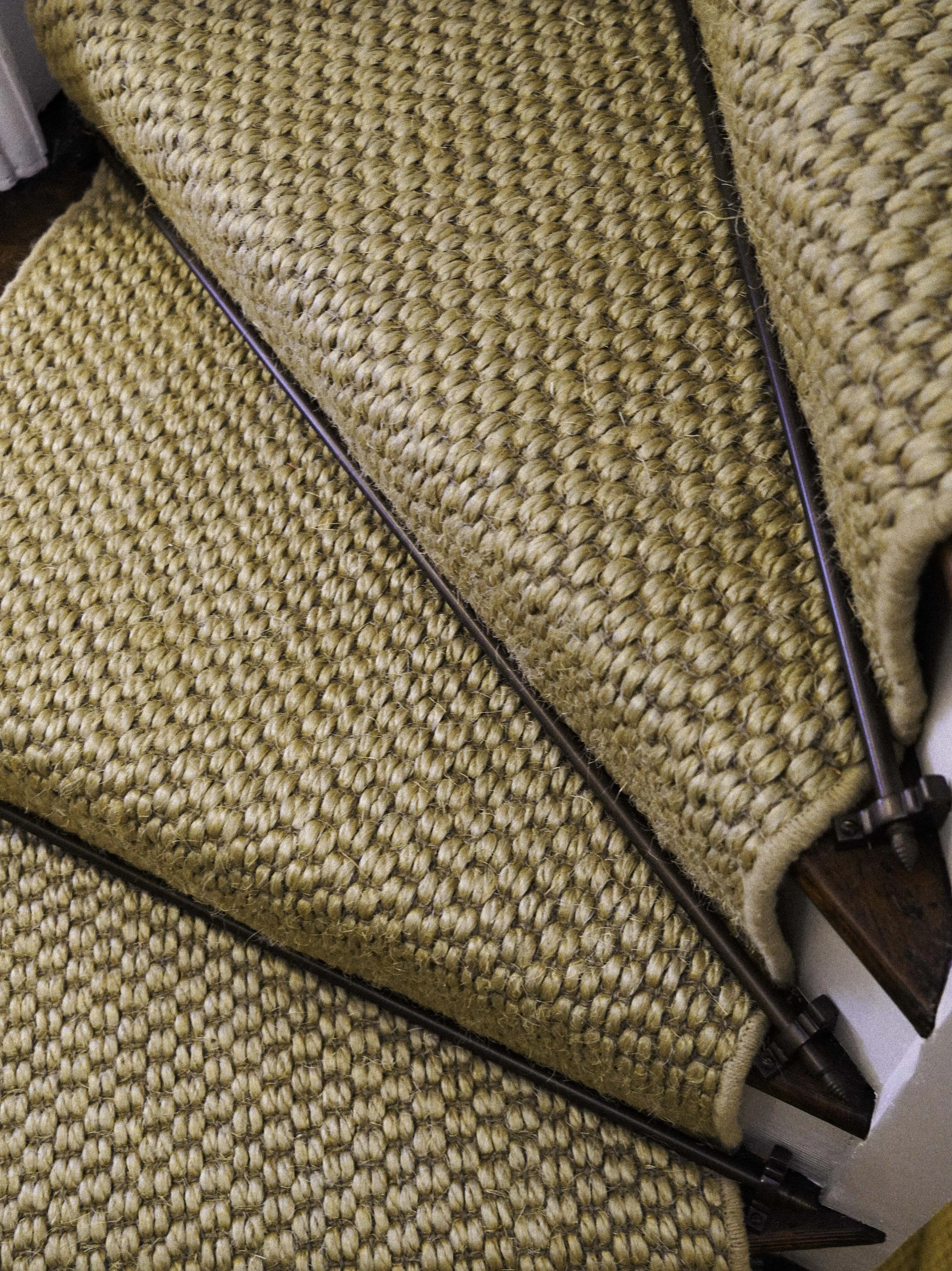 Close-up of a corner of a woven beige rug on a wooden floor with a rounded wooden furniture piece nearby.