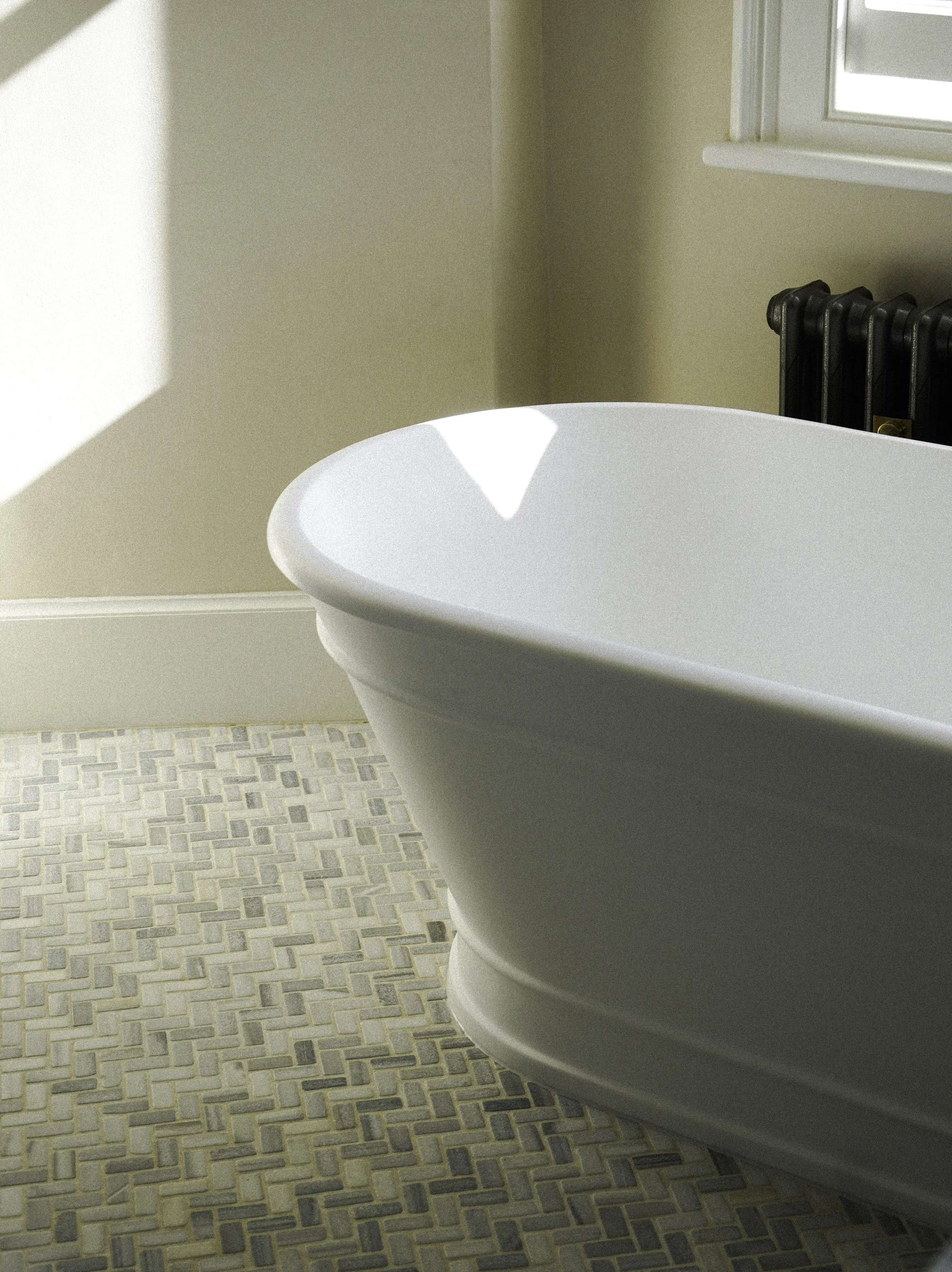 Close-up of a white bathtub in a bathroom with beige walls, a window, a radiator, and a patterned floor.