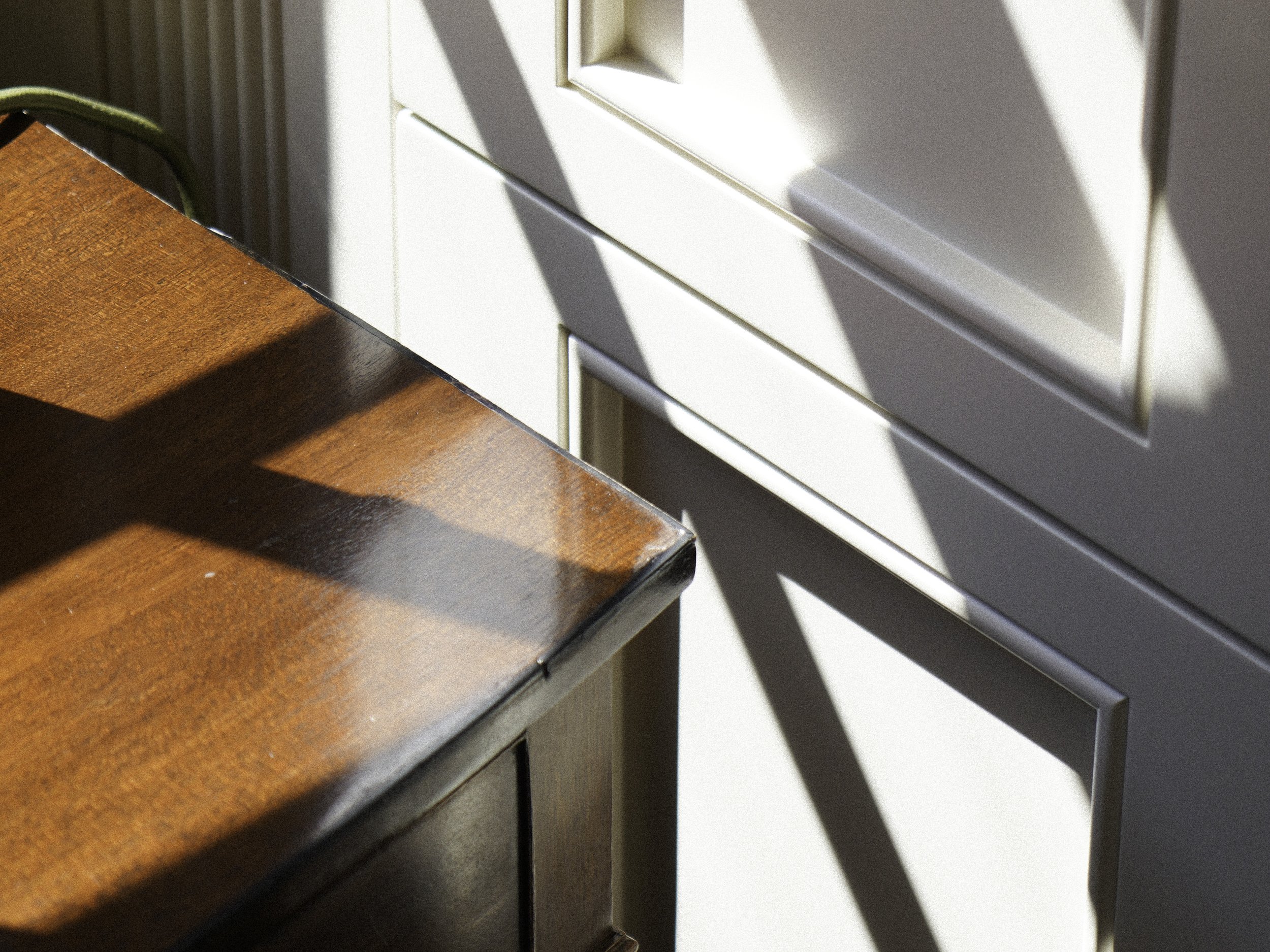 Close-up of a wooden table with sunlight and shadow patterns near a white cabinet or wall.