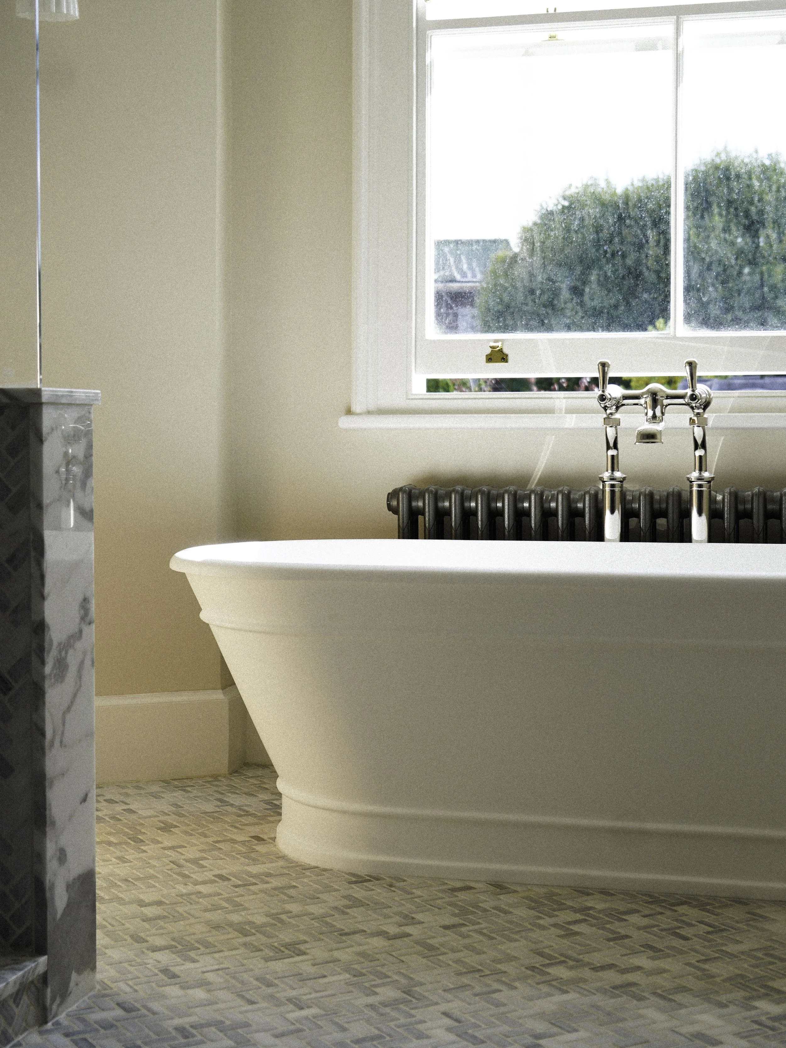 A white freestanding bathtub with a chrome faucet located in front of a window in a bathroom.