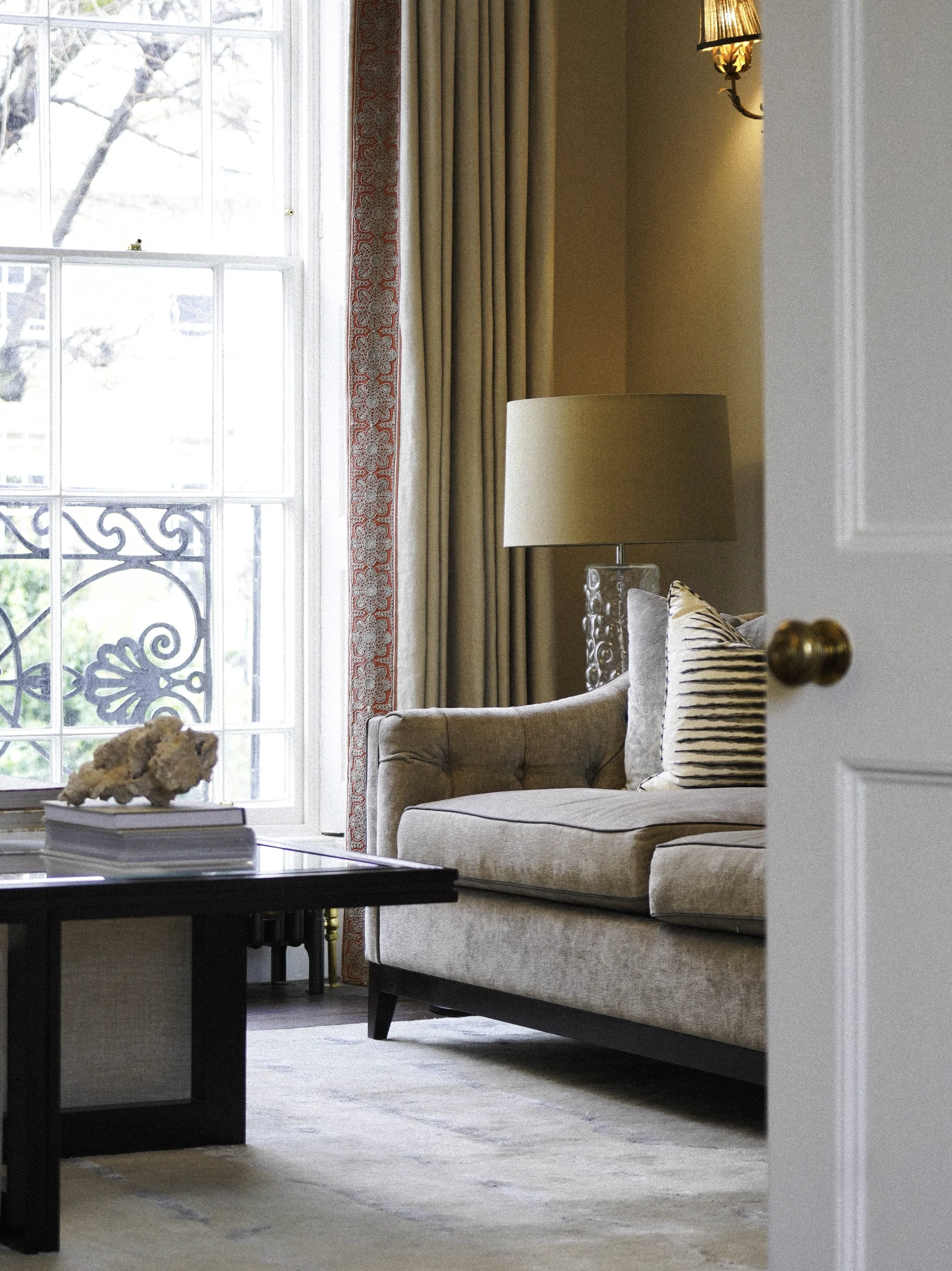 A cozy indoor lounge area with a white sofa and a black lamp with a beige lampshade, next to a window with beige curtains, opening to a lush garden patio with greenery and a black wrought iron railing.